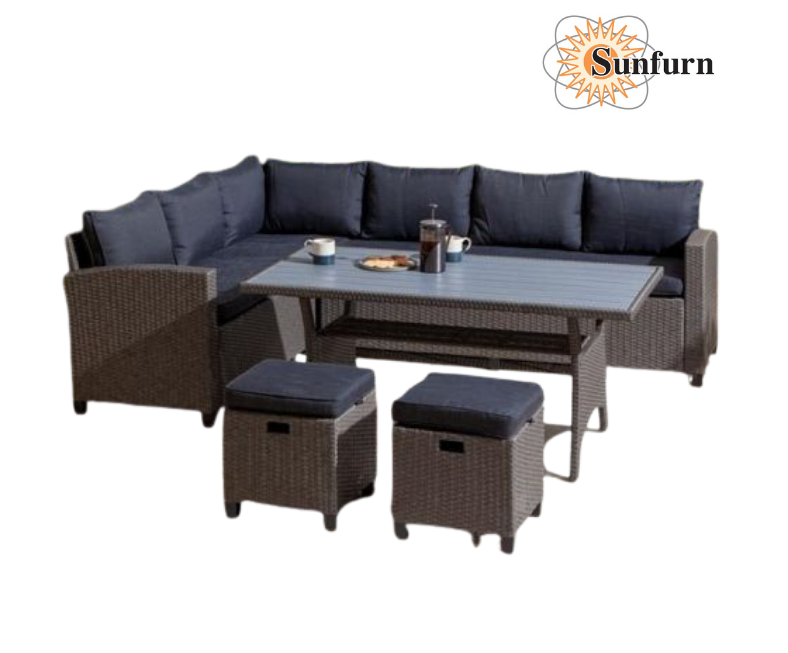 Crafted from weatherproof rattan effect with durable 8mm wicker, it ensures long-lasting beauty and resilience in any season. The set features a corner sofa, a spacious rectangular dining table, and two compact stools, offering versatile seating and dining options.